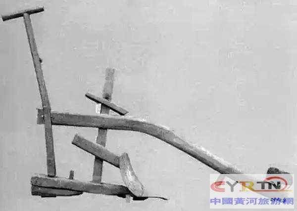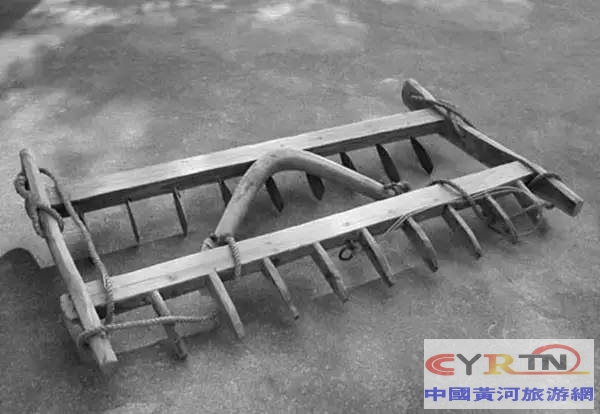 耧,由牲畜牵引,后面有人把扶,用来完成开沟和播种两项工作,这种农具在东北使用比较普遍,它也是现代播种机的前身。
