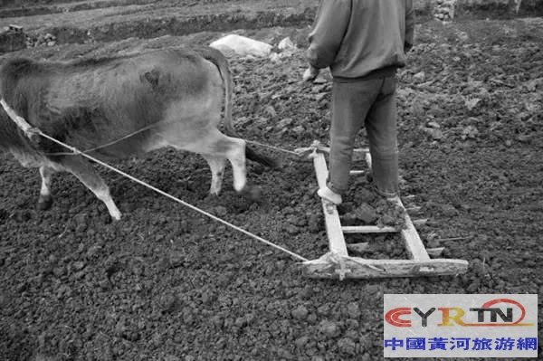耙田的动力也是靠牛来拉的。