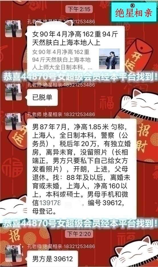 严选相亲信息:不是每个相亲信息都有机会进入本平台,9年来我们始终坚持现场登记真人相亲信息和证件审核;我们对待每个相亲信息的态度从来都不是差不多就行,而是要能“精确到0.1毫米”。