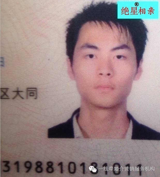 男88年2月 属龙 净高178 重160斤,山西人,内蒙古大学全日制本科,有能力上海郊区婚房首付,宝山区工作,外企生产管理,税后年十几万,未婚,开朗,上进,孝顺,家庭和睦。本人有一亲姐已婚在上海,父母有退休金。找:未婚或离婚未育,86年及以后,学历、收入、户籍不限。编号44416(女高级会员可得此男方联系方式或帮联系)母现场登记。状态:没找到