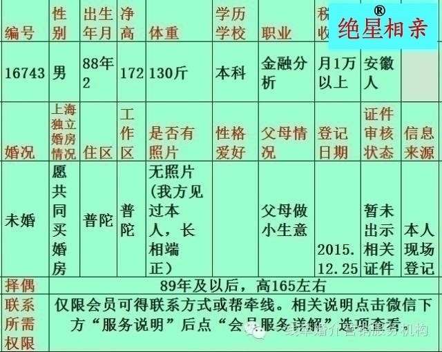 男88年8月 净高177重150斤 上海户口 安徽人 上海大学硕士 昆山有房 没留照片(我方曾见过照片,长相端正)独生子 国企员工 年税后13万 未婚 父母农村有农保 找:净高165及以上 南方人或上海人 本科及以上 长相要中上 条件相当 未婚。编号20531(仅限会员可得联系方式或帮牵线)母现场登记。状态:没找到