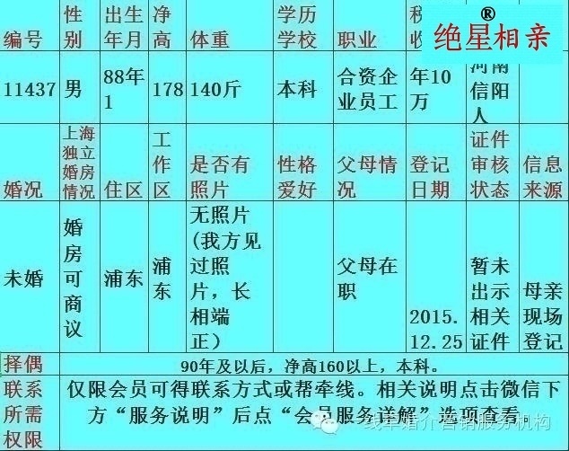男88年8月 净高1.73米,重140斤,全日制本科,浦东世纪大道软件开发工作,税后年15万,未婚,3个亲姐姐,湖南户口,父母已退休,皆为县城人,找:净高1.60米左右,户籍不限,聊得来即可,未婚。编号22407(付费成会员后可得联系方式或帮牵线)本人现场登记。状态:没找到