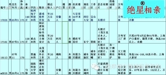 以下信息截图说明:1.点击图片后放大图片可查看信息详情。2.均为无照片人员,可联系相亲者获取照片。3.已登记信息且符合要求者可给公众号发送对方编号获取联方式或由我方帮牵线。