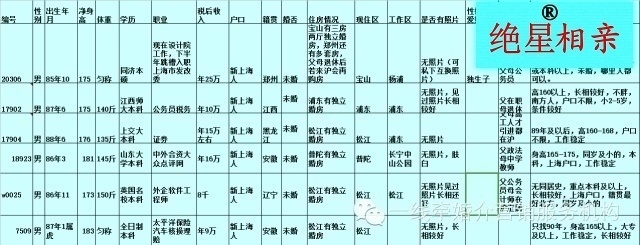 男 85年3月 净高178 匀称 年税后45万左右 全日制本科 河北人 闵行区自己家买的独立婚房 未婚,户囗还没落上海,外企互联网方面工作,没留照片(我方曾见过照片,长相中上,男方只愿私下自己给女方发看照片) ,家里有三个姐和一个弟,父母都有农保,找:长相要中上,不胖,净高160以上,87年以后,最好有上海户口,籍贯不限,未婚,大专以上。编号33133(仅限女高级会员或女VIP会员(有权撤销此男方信息)可得联系方式或帮牵线)父亲现场登记。状态:没找到