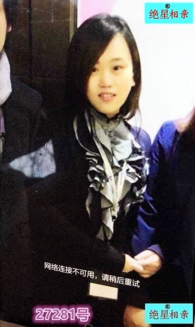 女 86年10月 净高160 重100斤 未婚 上海人 上外全日制本科 没在本平台留她照片(我方见过她照片,长相清秀,她只要私下自己给男发照片),浦东某外企策划部经理,工作稳定,年税后35万,开朗,孝顺,家庭和睦,父母退休在杨浦有房,本人名下上海另有房。找:77年及以后,大专以上,净高170以上,上海人或新上海人,有独立婚房。编号53287,母现场登记。状态:没找到