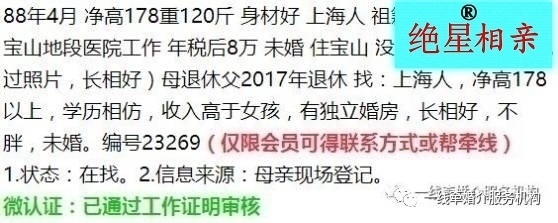 女 88年6月 净高172重110斤 专升本 上海人 浦东新区工作 民营金融审核工作 税后月6千左右 末婚 没留照片(我方曾见过照片,长相中上,女方只愿私下自己给男方发看照片)父母有房住宝山 母退休 找:大6岁内 净高180以上 大专或以上 上海人 收入高于女孩 有独立婚房 未婚 父母离异或单亲排除。编号:24657(仅男付费成会员者可得联系方式或帮联系)母亲现场登记。状态:没找到