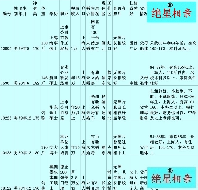 2.均为无照片人员,可联系相亲者私下获取照片。