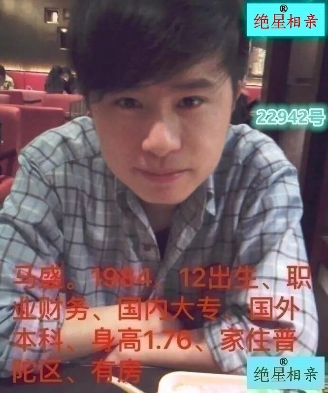 男 84年3月 净高173 重140斤 上海人 专升本 宝山三门路靠近虹口有95平米商品房的独立婚房无贷款 有车 短婚未育 工作在虹口 某上市公司职员,工作稳定,年税后30万,没在本平台留他照片(我方见过他照片,长相端正,他只要私下自己给女发照片),开朗,上进,孝顺,家庭和睦,父母退休在宝山另有房。找:85年及以后,净高155及以上,上海人或新上海人,离婚未育或未婚。编号51134,母现场登记。状态:没找到