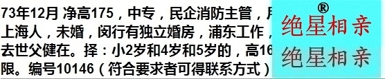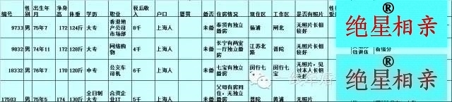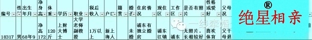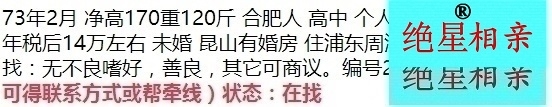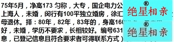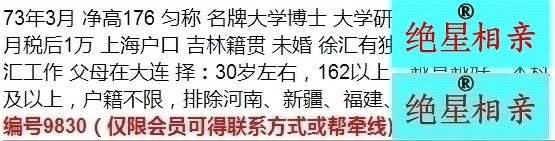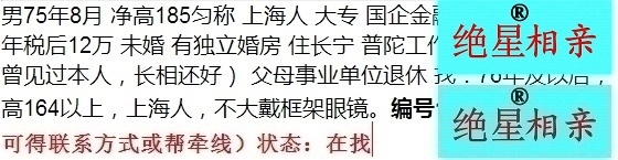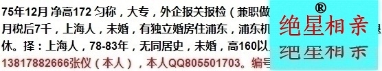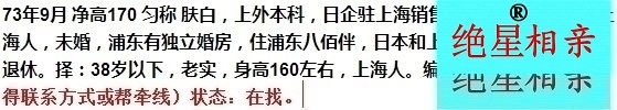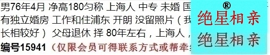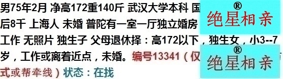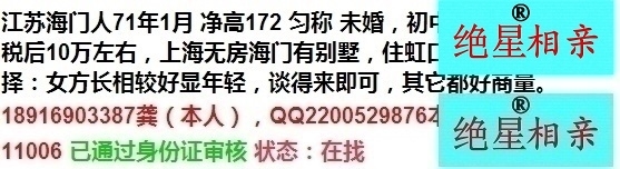 男 71年4月 净高174 上海人 电大本科 有独立独房在虹口74平方 浦东机场工作 航空货运公司(物流) 年税后12万左右 未婚 有一亲姐已婚 父去逝 母退休住虹口区 找:79年及小的 净高160以上 上海人 大专或以上 稳定工作 未婚。编号32642(仅付费成会员者可得联系方式或帮牵线)母现场登记。状态:没找到