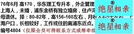 男 71年3月 净高174 匀称 上海人 上大大专 普陀区工作 贸易公司部门经理 税后年20万以上 未婚 浦西大华有96平米独立婚房 住普陀 有一个亲哥 爱好运动旅游唱歌,之前谈过恋爱 父母退休 找:80年左右 上海人 未婚 净高163-168,工作一般,长相清秀。编号:20943(仅付费成会员者可得联系方式或帮联系)本人现场登记。状态:没找到