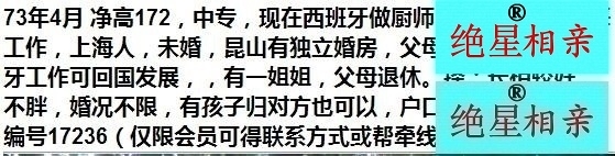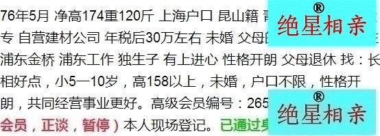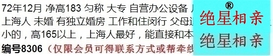 男,72年2月,净高179,重160斤,未婚,上海人,上交大本科,浦东有独立婚房,研究所高级工程师,年税后15万以上,没留照片(我方曾见过照片,长相端正,男方只愿私下自己给女方发看照片),父母住浦东 找:上海人,80-87年,净高163及以上,未婚,大专及以上。编号28625(仅付费成会员者可得此编号人的联系方式或帮牵线)父现场登记。状态:没找到