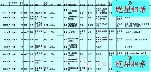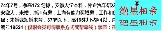 76年,净高175,匀称,无照片(我方见过本人,长相一般),东华大学硕士,项目经理,月税后2万,上海人,未婚,有独立婚房住闵行,浦东张江工作。择:81年及以后,长相较好,上海人。编号6818(仅限会员可得联系方式或帮牵线)母亲现场登记。状态:没找到