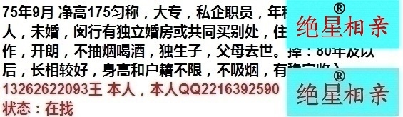 74年9月 净高173重130斤 大专 私企酒店管理 年税后12万 贵州人 未婚 无房 工作和住浦东 无照片(我方见过本人,长相端正)开朗 父母老家做生意 择 74-80年,户口不限。编号16501(仅限会员可得联系方式或帮牵线)本人现场登记。状态:在找