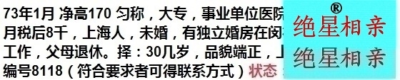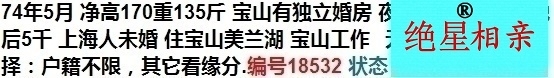 上海人 76年2月 净高174 匀称 未婚,中专,合资企业汽配,月税后8千,宝山淞南有独立婚房,宝山工作,父母退休。找:过日子的,不胖,诚实。母亲现场登记。编号:12103