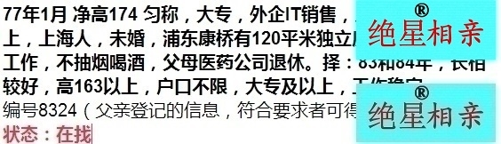 75年12月 净高180匀称 无照片(我方曾见过照片,长相还好) 大专 国企物业电子 月税后8千 上海人未婚 愿婚房共买 住普陀近长风公园 工作黄浦 父母教师退休 找:75一80年 高160以上 本份 单亲家庭不要 长相一般就能接受。编号20602(仅限会员可得联系方式或帮牵线)母亲现场登记。状态:在找