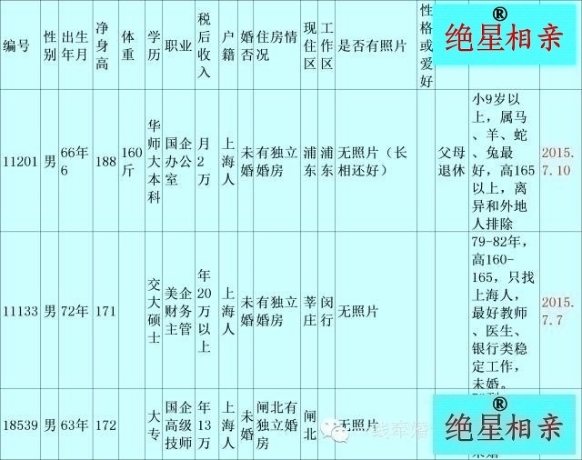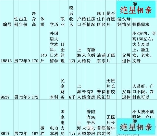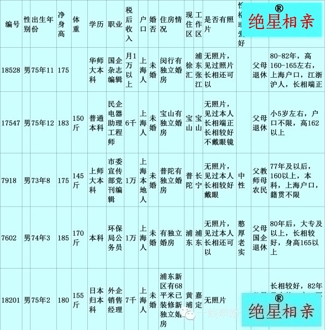 男 74年6月 净高170重130斤,上海人,华东理工的全日制本科,杨浦区有73平米的独立婚房,人民日报技术部经理,年税后20万左右,未婚,没留照片(我方曾见过照片,肤白,长相显年轻,戴眼镜,男方只要私下自己给女方发看照片),不抽烟不喝酒,无不良嗜好,父母企业退休在杨浦区另有房 找:80年后,长相中上显年轻,净高157一165,大专或以上,只上海人,收入不限,未婚。编号24624(仅女高级会员或超级会员(优先联系)可得男方本人和父亲联系方式或帮联系)父亲现场登记。状态:没找到
