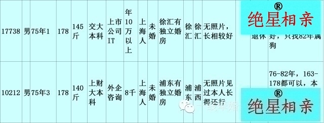 75年1月净高178匀称上交大本科 无照片(我方曾见过照片,长相较好) 上市公司软件工程师 年税后15万以上 上海人未婚 徐汇有65平米独立婚房 住徐汇 陆家嘴工作 有一姐已成家 父母大学生 择82-85年,长相较好显年轻,净高162-170,最好上海人。编号26015(仅限会员可得联系方式或帮牵线)母亲现场登记。状态:没找到