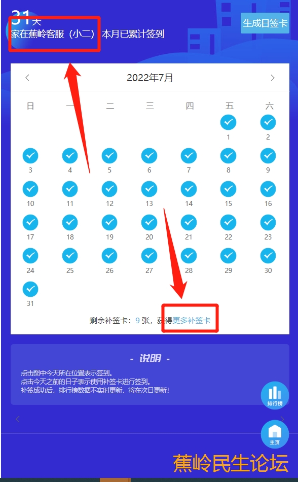 2022年7月签到全勤奖励:回复留言领开心红包+3张补签卡