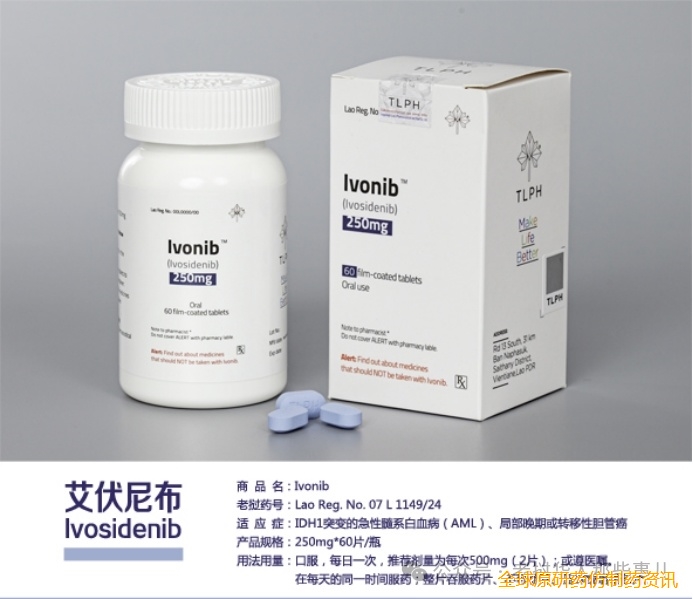 7月29日,老挝卫生部食品药品司(FDD)正式批准老挝东盟制药(TLPH)生产的艾伏尼布(Ivosidenib)上市!东盟制药的艾伏尼布,商品名为Ivonib,片剂,规格为250mg*60片/瓶。艾伏尼布(亦称:依维替尼)为一款针对IDH1基因突变的强效口服靶向药物,最早由美国Agios制药公司研发,后经Servier制药公司通过收购Agios制药公司的肿瘤业务而获得了该产品的权益。