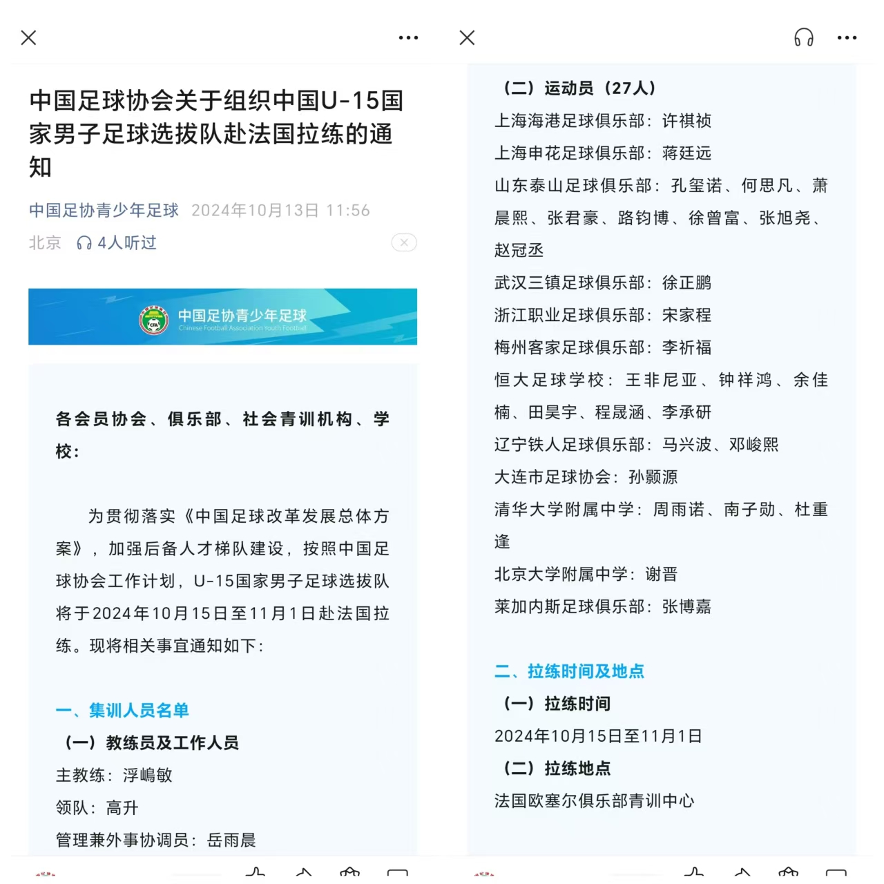 我县田昊宇同学入选U15国家队,队员们10月15号代表中国去法国进行拉练交流赛。