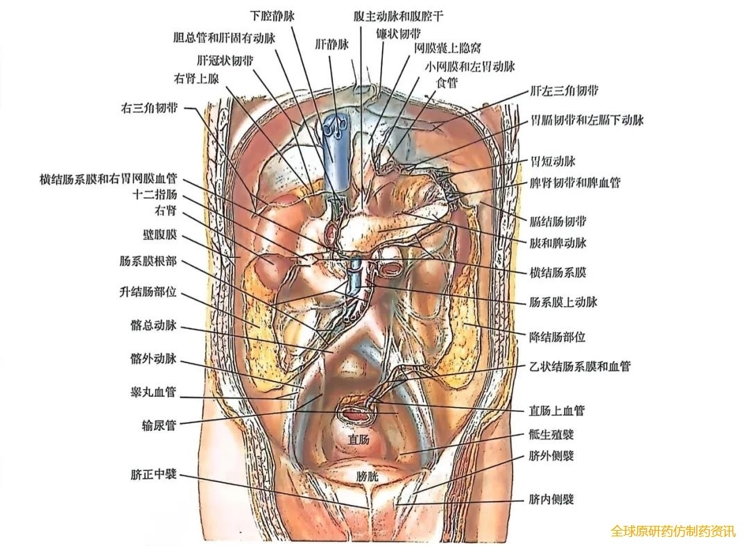腹膜后腔包含多个重要器官,如肾脏、胰腺,以及下腔静脉和腹主动脉等(图1)。这些结构彼此紧密相邻,因此容易受到腹膜后肿瘤的压迫。因此,术前需要进行影像。