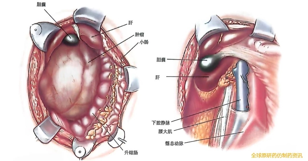 在肿瘤完全暴露后,应充分评估其对周围组织结构的侵犯程度。肿瘤边缘的侵犯情况会影响患者的生存率,因此应尽可能完整地切除肿瘤组织。这也意味着需要切除肾脏、部分结肠、相关血管和部分十二指肠。
