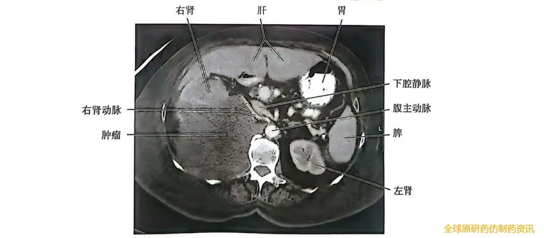 如果CT影像显示腹膜后有一个较大的肿瘤,且这个肿瘤已侵犯到下腔静脉和右肾(图2),那么就需要在进行肾切除术前对肾功能进行评估,并咨询血管科医生以规划血管切除手术。