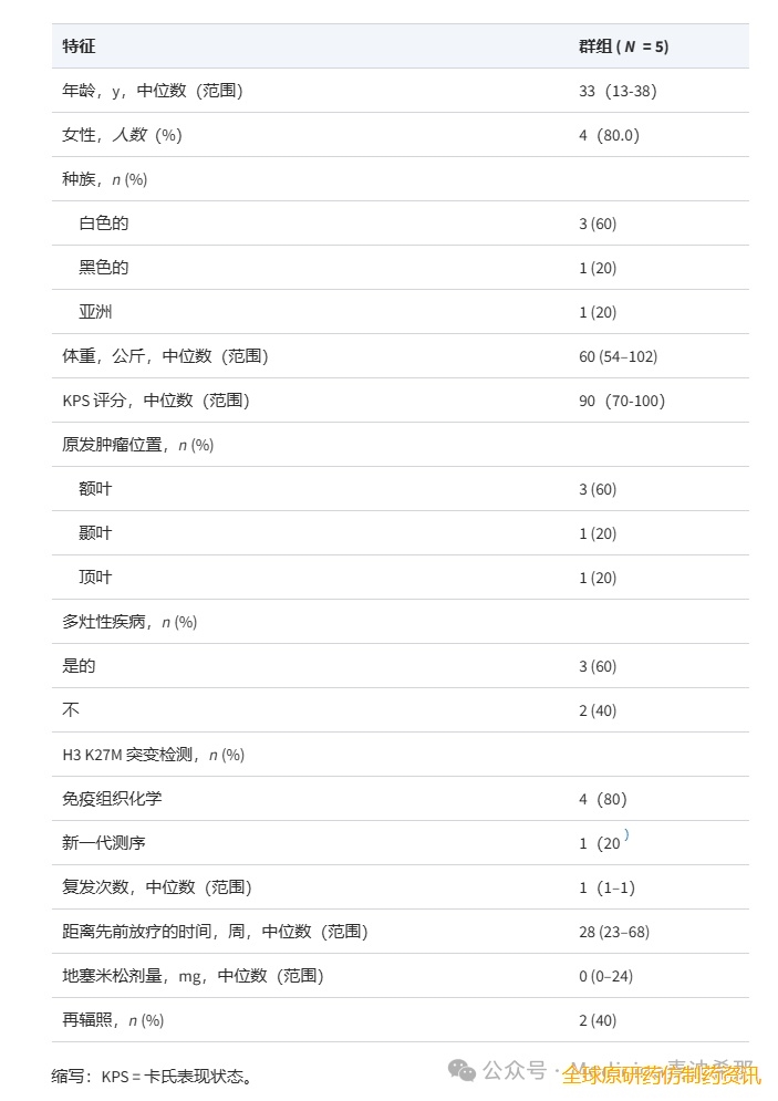 来自3个不同机构的5名患者被BICR认定为患有非中线肿瘤。人口统计学信息见表1,临床摘要见表2。中位年龄为33岁(范围:13-38岁)。患者以女性(4/5,80%)和白种人(3/5,60%)为主。3例(60%)的肿瘤原发部位为额叶,1例(20%)的肿瘤原发部位为颞叶,1例(20%)的肿瘤原发部位为顶叶;5名患者中有3名(60%)在入组时患有多灶性病变。4/5(80%)的病例经免疫组织化学证实存在H3 K27M突变,1例(20%)的病例经二代测序(NGS)检测出H3.1 K27M突变。所有患者均在首次肿瘤复发时入组,中位时间为初次放疗结束后28周(范围:23-68周)。大多数患者未使用皮质类固醇;1 名患者在入组时服用 24 毫克地塞米松。研究入组时的卡诺夫斯基功能量表 (KPS) 功能评分中值为 90(范围为 70-100)。