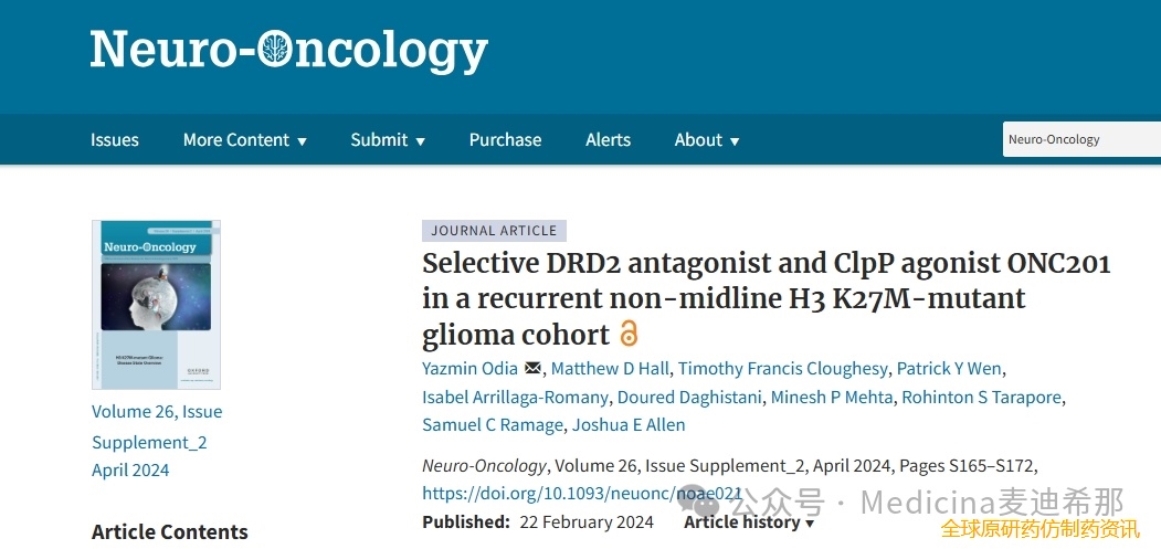 ONC201 是一种在研小分子抗肿瘤药物,可穿过血脑屏障,既是选择性多巴胺 DRD2/3 拮抗剂,导致 Akt 和 ERK 双重失活以及 TRAIL 介导的细胞凋亡,又是酪蛋白水解蛋白酶 P 激动剂,导致癌细胞线粒体功能障碍。在一项2期试验中,ONC201 并未改善未进行分子分层的成人复发性胶质母细胞瘤的无进展生存期,但最初一系列携带 H3 K27M 突变的患者表现出持续的临床和放射学反应。已完成的儿科 1 期试验的首批结果最近已发表,同时公布了良好的临床结果,包括扩大入路病例的完全缓解。ONC201 目前正在进行一项随机 3 期试验,针对新诊断的 H3 K27M 突变型弥漫性胶质瘤 [NCT05580562]。