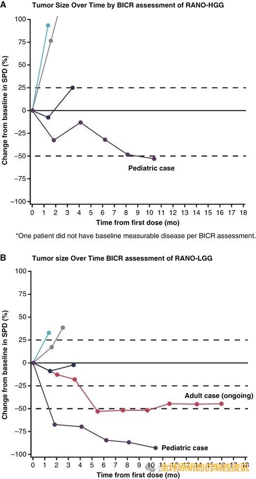 图1.复发性非中线 H3 K27M 突变型弥漫性神经胶质瘤患者:根据 RANO 标准,肿瘤测量值随时间的变化。根据 (A) RANO 高级别神经胶质瘤 (RANO-HGG)* 和 (B) RANO 低级别神经胶质瘤 (RANO-LGG) 标准,肿瘤测量值随时间的变化。入组截止日期:2020 年 2 月 27 日;数据截止日期:2021 年 5 月 31 日。仅纳入经当地研究者评估,在基线和基线后评估中均具有可测量靶增强病变的患者。BICR = 盲法独立中央审查;RANO = 神经肿瘤学反应评估;SPD = 垂直直径乘积之和(每个 BICR 的靶增强病变)。*一名患者根据 BICR 评估没有基线可测量疾病。