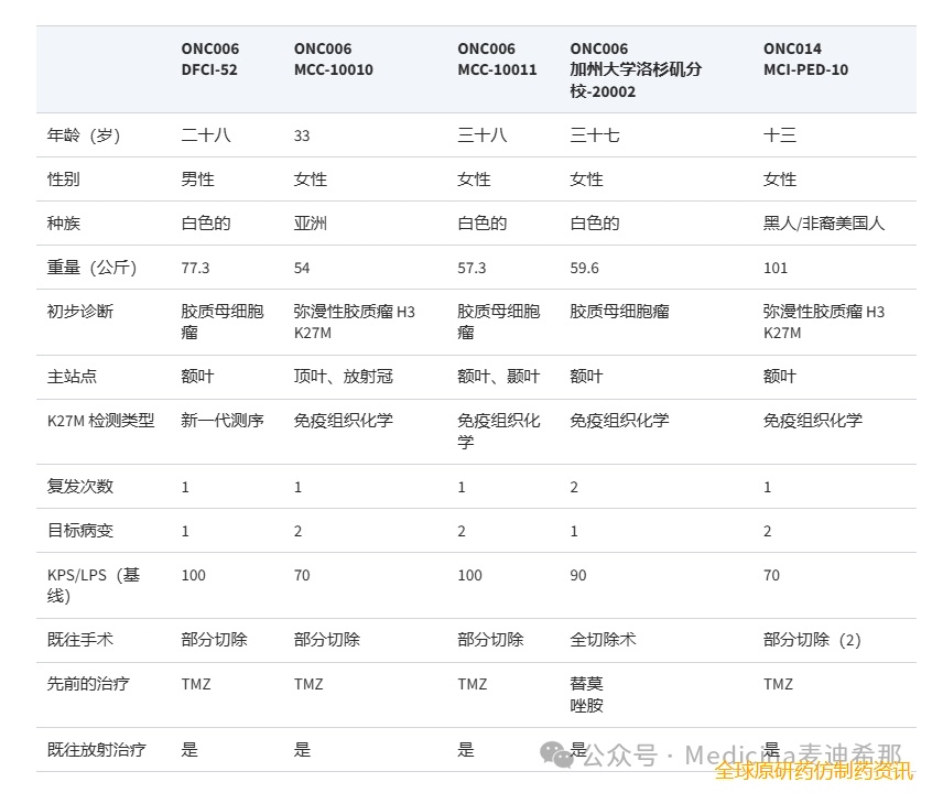 5 项试验招募了接受 ONC201 治疗的复发性非中线 H3 K27M 突变型弥漫性胶质瘤患者。入选条件包括通过神经肿瘤学反应评估 (RANO) 可测量疾病的高级别胶质瘤、Karnofsky/Lansky 表现评分≥60 且放疗后≥90 天。主要终点是总体反应率 (ORR)。
