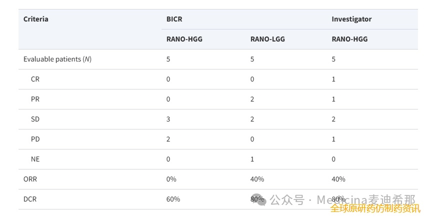 缩写:BICR = 盲法独立中央审查;CR = 完全缓解;DCR = 持久控制率(CR + PR + SD);HGG = 高级别胶质瘤;LGG = 低级别胶质瘤;NE = 无法评估;ORR = 总体缓解率(CR + PR);PD = 进行性疾病;PR = 部分缓解;RANO = 神经肿瘤学反应评估;SD = 稳定疾病。