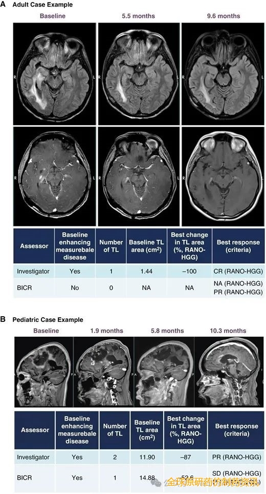 图2.ONC201 应答者案例研究。使用 ONC201 治疗的成人完全缓解病例 (A) 和儿童部分缓解病例* (B) 的脑部 MRI 随时间变化。*对于儿童病例 (2B),TL 区域的最佳变化实现了 PR 所需的 >50% 减少;然而,BICR 检测到的此时间点的新病变导致 HGG-RANO 的总体最佳反应为 SD。BICR = 盲法独立中央审查;CR = 完全缓解;HGG = 高级别胶质瘤;LGG = 神经肿瘤低级别胶质瘤;NA = 不适用;PR = 部分缓解;RANO = 神经肿瘤反应评估;TL = 靶病变。