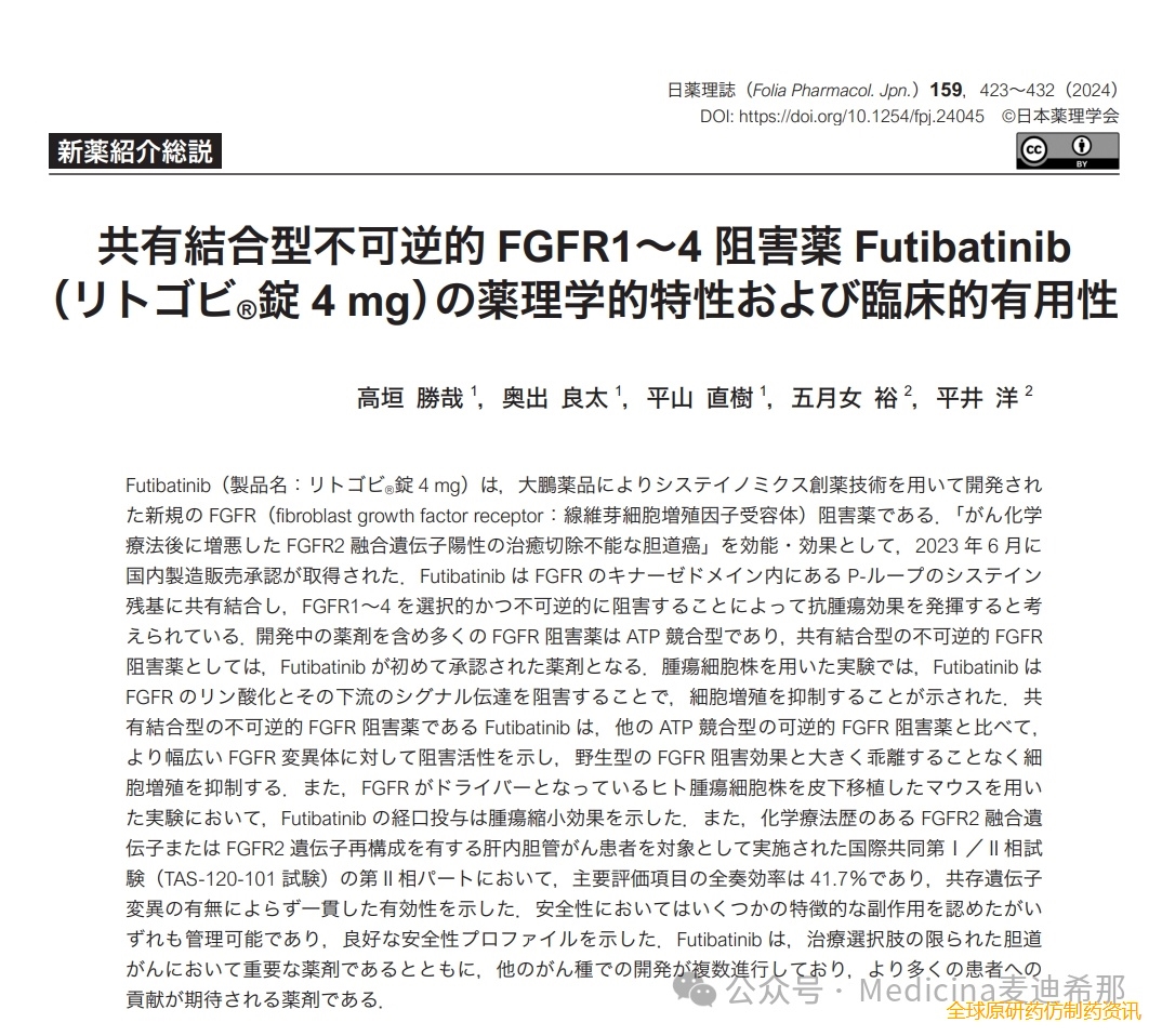 Futibatinib(商品名:LYTGOBI® Tablets 4 mg)是大鹏制药采用半胱氨酸组学药物发现技术开发的新型 FGFR(成纤维细胞生长因子受体)抑制剂。于2023年6月获得日本国内生产和销售批准,适应症为“癌症化疗后进展的FGFR2融合基因阳性的不可切除的胆道癌”。Futibatinib与FGFR激酶结构域内P环的半胱氨酸残基共价结合,被认为通过选择性且不可逆地抑制FGFR1-4来发挥抗肿瘤作用。许多 FGFR 抑制剂,包括目前正在开发的抑制剂,都具有 ATP 竞争性,而 Futibatinib 是第一个获得批准的共价不可逆 FGFR 抑制剂。使用肿瘤细胞系的实验表明,Futibatinib 通过抑制 FGFR 磷酸化及其下游信号传导来抑制细胞增殖。Futibatinib 是一种共价不可逆 FGFR 抑制剂,与其他 ATP 竞争性可逆 FGFR 抑制剂相比,对更广泛的 FGFR 突变体表现出抑制活性,并且对野生型 FGFR 具有显著更强的抑制作用,可抑制细胞增殖而不引起解离。此外,在使用皮下植入FGFR驱动的人类肿瘤细胞系的小鼠进行的实验中,口服Futibatinib显示出肿瘤缩小效果。此外,全球I/II期研究(TAS-120-101研究)的II期部分是在接受化疗的FGFR2融合基因或FGFR2基因重排的肝内胆管癌患者中进行的,主要终点是总体缓解率为 41.7%,无论是否存在共存基因突变,都表现出一致的功效。关于安全性,虽然观察到一些特征性副作用,但所有副作用都是可控的,并且显示出良好的安全性。福巴替尼是治疗胆道癌的重要药物,治疗选择有限,目前正在开发用于其他几种癌症类型的药物,这使其成为有望为更多患者做出贡献的药物。