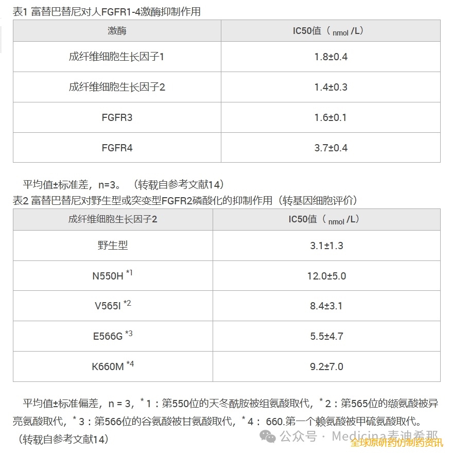 使用荧光标记底物通过迁移率变动法评价福巴替尼对人FGFR1-4(重组蛋白)激酶活性的抑制作用(表1)。在一组 296 种人类激酶中,Futibatinib 选择性抑制 FGFR1-4,50% 抑制浓度范围为 1.4 至 3.7 nmol/L。使用表达野生型或四种突变型FGFR2的人胎肾来源的HEK293细胞系,通过ELISA评估Futibatinib对FGFR2磷酸化的抑制作用(表2)。福巴替尼对所有突变体均表现出与野生型相同程度的磷酸化抑制活性,野生型福巴替尼的 IC 50值为 3.1 nmol/L,突变体为 5.5 至 12.0 nmol/L14 ).在 FGFR 基因异常的肿瘤细胞系中,Futibatinib 与 FGFR 激酶结构域共价结合并抑制 FGFR 磷酸化,从而抑制下游信号转导。