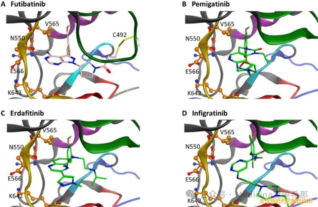 图1 预测 Futibatinib 和 ATP 竞争性可逆 FGFR 抑制剂在 FGFR2 ATP 结合袋上的相互作用。被鉴定为抗性突变的氨基酸残基以球棒模型显示,并且氨基酸位置编号写为单个字母。激酶结构域区域如下:金色,铰链区;蓝色,激活结构域;绿色,P-环;DFG 基序。Futibatinib 与 P 环的 C492 共价结合,并且可以保留在 ATP 结合口袋中,无论是否存在阻止 ATP 竞争性可逆 FGFR 抑制剂(如 Erdafitinib、Pemigatinib 和 Infigratinib)结合的耐药突变。