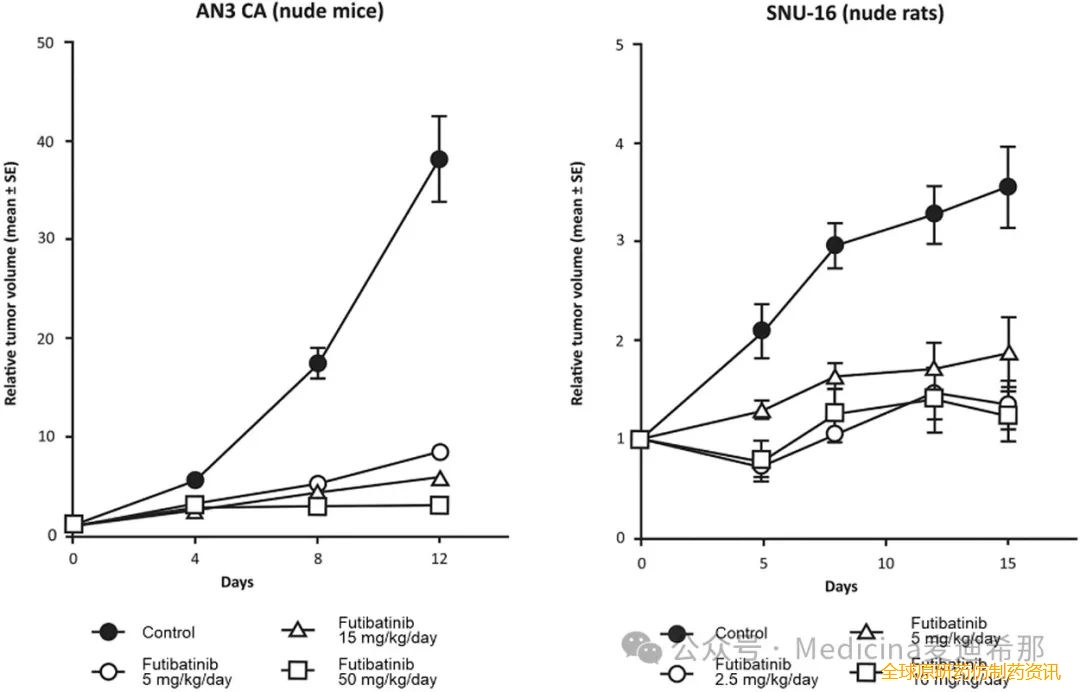 图2. 福巴替尼对皮下植入人类肿瘤细胞系的裸鼠和大鼠的疗效。平均值±标准误差。(A)皮下移植表达突变FGFR2(K310R/N549K)的人子宫内膜癌细胞系AN3 CA裸鼠(6例/组),(B)FGFR2基因扩增的人胃癌细胞系SNU福巴替尼的肿瘤生长抑制作用采用皮下植入福巴替尼的裸鼠(6例/组)进行研究。每个剂量的 Futibatinib 在第 1 至 11 天每日一次口服给药,研究开始日期为第 0 天,并在第 12 天计算肿瘤体积。
