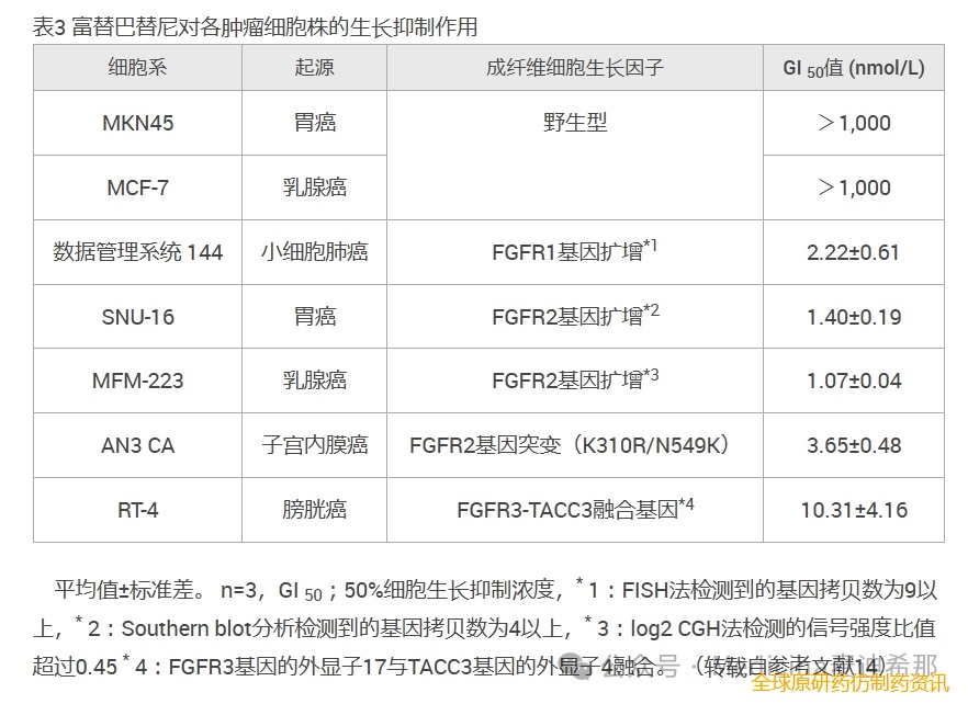 Futibatinib 是一种有效的选择性生长抑制剂,适用于多种 FGFR 基因异常的肿瘤细胞系(胃癌、乳腺癌、小细胞肺癌、子宫内膜癌和膀胱癌),无论基因异常的类型如何)(表3)。在以FGFR为驱动力的多种人类肿瘤系移植模型中,口服Futibatinib显示出肿瘤缩小效果(图2),并且该效果与FGFR磷酸化的抑制相关。