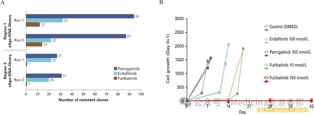 图3 由于接触Futibatinib和ATP竞争性FGFR抑制剂而出现耐药克隆 使用依赖 FGFR 激酶活性增殖的细胞模型,我们评估了暴露于 Futibatinib 和 ATP 竞争性可逆 FGFR 抑制剂后出现的耐药克隆的数量。(A) 将单个氨基酸取代随机引入 FGFR2 激酶结构域的两个区域的载体在细胞系中表达并暴露于药物。将细胞增殖抑制率小于50%的细胞定义为耐药克隆,统计两次不同实验中出现的克隆数。(B)将每种药物暴露于已导入相同FGFR突变体文库的细胞模型后,测量出现耐药细胞所需的天数。暴露期间每种药物的浓度是对引入野生型FGFR2的90%的细胞表现出细胞杀伤作用的浓度(LD90)的10倍。