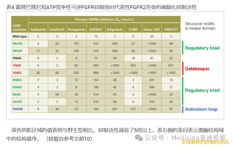 关于FGFR抑制剂,人们担心获得肿瘤耐药性可能会导致疾病进展,而耐药机制之一是FGFR激酶结构域中发生的二次突变。二次突变(例如守门突变)的发生会导致空间位阻并阻止 FGFR 抑制剂的结合。据报道,ATP竞争性可逆FGFR抑制剂如erdafitinib和pemigatinib(上面列出的两种药物均已获得FDA批准)对此类耐药突变影响不大,下一代药物开发的可能性较小需要FGFR抑制剂。