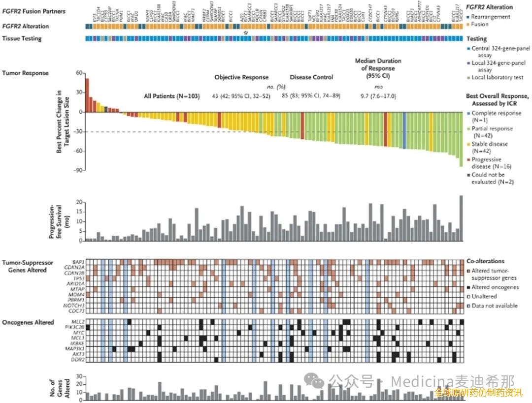 图4 国际联合I/II期研究(TAS-120-101研究)II期部分(FOENIX-CCA2研究)中福巴替尼的抗肿瘤疗效及每位患者的基因谱 使用 324 基因面板分析评估 FGFR2 基因突变。显示每位患者 FGFR2 基因异常(融合或重排)的状态,以及已识别的任何融合伙伴。*:一名患者除了 FGFR2 基因融合外,还存在FGFR2 S799fs * 22 突变。瀑布图中显示了个体患者的目标病变肿瘤大小相对于基线的变化率,并且还列出了分析人群中的总体缓解率、疾病控制率和缓解持续时间的值。使用 324 基因组检测评估共存的基因突变。至少九名患者中显示出最常见的共病基因突变。图底部的条形图显示了每名患者通过面板检测鉴定出的基因突变总数。由于缺少肿瘤评估,三名患者未包括在内。
