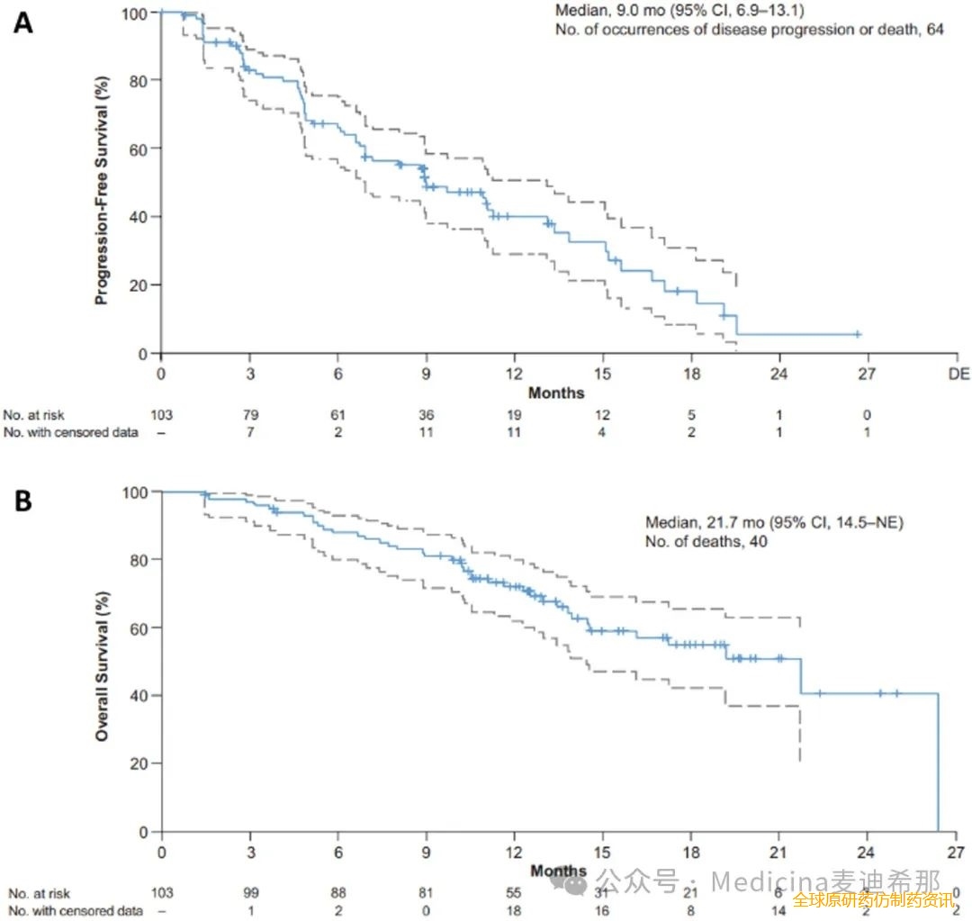 图6 全球I/II期研究(TAS-120-101研究)II期部分(FOENIX-CCA2研究)中Futibatinib治疗患者的无进展生存期和总生存期 (A) 无进展生存期和 (B) 总生存期的 Kaplan-Meier 曲线。虚线表示 95% 置信区间的上限和下限。