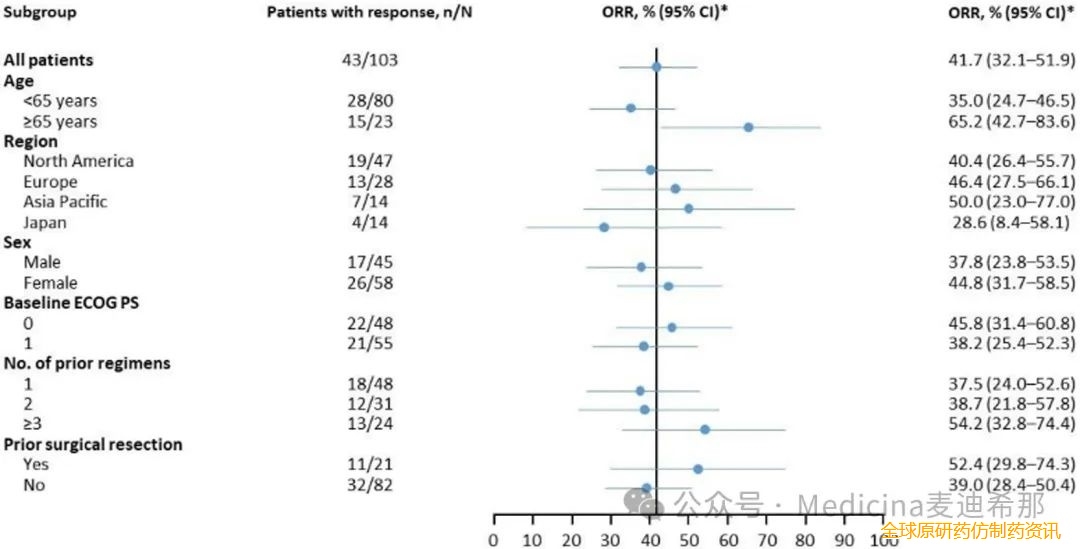 图5 全球I/II期研究(TAS-120-101研究)II期部分(FOENIX-CCA2研究)Futibatinib治疗患者总体缓解率亚组分析 CI:置信区间,ECOG PS:东部肿瘤合作组表现状态,ORR:客观缓解率。总体答复率表示为客观答复率。*:置信区间的宽度尚未调整以考虑多重性。