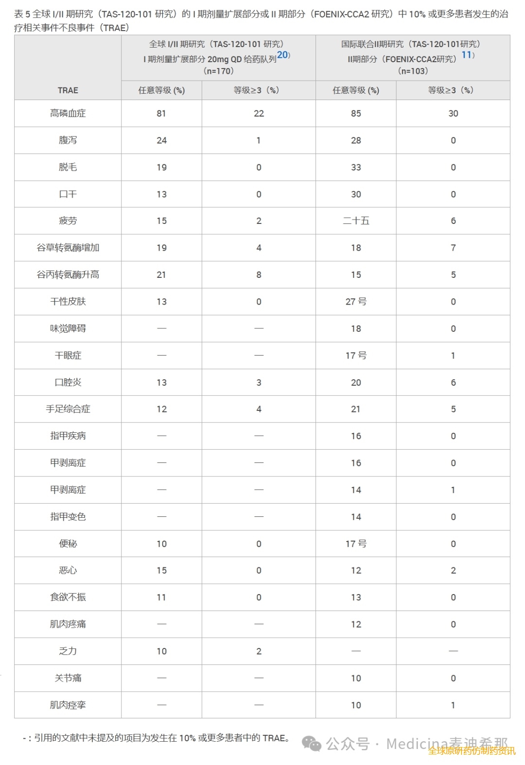福巴替尼 20 mg 在国际联合 I/II 期研究(TAS-120-101 研究:NCT02052778)的I 期剂量扩展部分(n=170) 和 II 期部分(n=103) QD 给药的安全性与其他 FGFR 抑制剂相似(表5)。国际联合I/II期研究(TAS-120-101研究)的I期剂量扩展部分和II期部分级别为 25% 或更高的患者中发生的治疗相关不良事件 (TRAE) 包括高磷血症(81%、85%)、腹泻(24%、28%)、疲劳(15%、25%)和口干(13%、30%)、脱发(19%、33%)、皮肤干燥(13%、27%)。Pemigatinib 和 Infigratinib 经常发生高磷血症(Pemigatinib:77%,Infigratinib:55%),并且是由 FGFR 抑制导致的 FGF23-FGFR1 信号传导减少引起的,被认为是由磷酸盐重吸收增加引起的。在 I 期剂量扩展和 II 期部分中,分别有 43% 和 57% 的患者发生 3 级或以上 TRAE,并且两项研究中 ≥10% 的患者普遍报告高磷血症(22%、30%)。每项研究均报告了一项 4 级 TRAE(γ-谷氨酰转移酶增加和丙氨酸氨基转移酶增加)在 I 期剂量扩展部分中,有 6% 的患者报告了严重的 TRAE,在 II 期部分中,有 10% 的患者报告了严重的 TRAE,两种情况下都没有与治疗相关的死亡。福巴替尼组高磷血症(3级或以上)发生率高于报道的Pemigatinib和Infigratinib 的原因可能与所用不良反应等级定义的差异有关。(在 Futibatinib 试验中,高磷血症的等级是根据血清磷酸盐水平来评估的,无论症状如何)在上述两项 Futibatinib 研究中,除 2 名因疾病进展和撤回同意而终止研究的患者外,所有患者的 3 至 4 级高磷血症均得到缓解。FGFR 抑制剂常见的其他典型不良事件包括眼睛和指甲毒性。在国际联合I/II期研究(TAS-120-101研究)的II期部分中,观察到视网膜损伤的比例为8%(3级或以上:0%),干眼症为21%(3级或以上:1%),47% 的患者出现指甲毒性(2% 为 3 级或以上)。福巴替尼引起的大多数不良事件可以通过停止给药或减少剂量来控制。在 I 期剂量扩展部分,TRAE 导致 44% 的患者发生剂量变化,并导致 4% 的患者停止治疗。在II期部分,因TRAE而中断治疗、减少剂量或停止治疗的患者比例分别为50%、54%和2%。