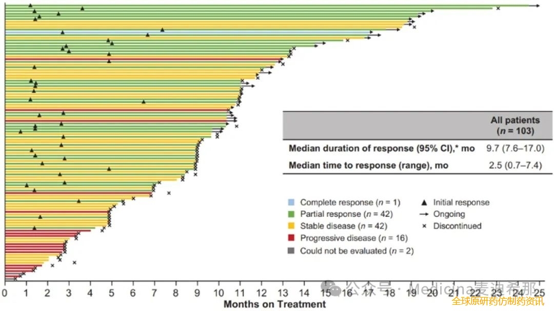 在全球 I/II 期研究(FOENIX-CCA2 研究)的 II 期部分中,对 103 名接受过至少一种全身化疗方案的携带 FGFR2 基因融合或重排的不可切除的晚期肝内胆管癌患者进行了评估。主要终点(独立中央评估)的 ORR 为 41.7%(43/103,95% CI,32.1-51.9)(图4)。即使在包括预后不良的患者的亚组中,ORR 也是一致的,例如年龄为 65 岁或以上的患者以及具有广泛既往治疗史(之前接受过三次或以上治疗)的患者(图5)。中位随访时间为 17.1 个月,中位无进展生存期 (PFS) 为 9.0 个月(95% 置信区间,6.9-13.1),中位总生存期 (OS) 为 21.7 个月,1 年生存率为 72%。(图6)。随访结果(中位25.0个月)相似:ORR为41.7%,中位OS为20.0个月(1年生存率为73%),中位PFS为8.9个月。中位缓解时间 (TTR) 为 2.5 个月(范围:0.7 至 7.4),中位缓解持续时间 (DOR) 为 9.7 个月(95% 置信区间;7.6 至 17.0),72% 的患者有缓解(31/43)。缓解持续了6个多月(图7)。探索性数据表明,即使在接受 FGFR 抑制剂治疗的胆道癌患者中,Futibatinib 也具有抗肿瘤作用。在 TAS-120-101 研究的 I 期剂量扩展部分中,28 名有 FGFR 抑制剂治疗史的患者中,有 5 名(17.9%)观察到缓解,另外 15 名患者(53.6%)病情得到控制.在I期部分的病例中,对4例既往有FGFR抑制剂Infigratinib或Zoligratinib治疗史的患者进行分析,其中2例显示PR,2例显示SD,显示出一定程度的临床有用性,效果的持续时间是 5.1 至 17.2 个月。