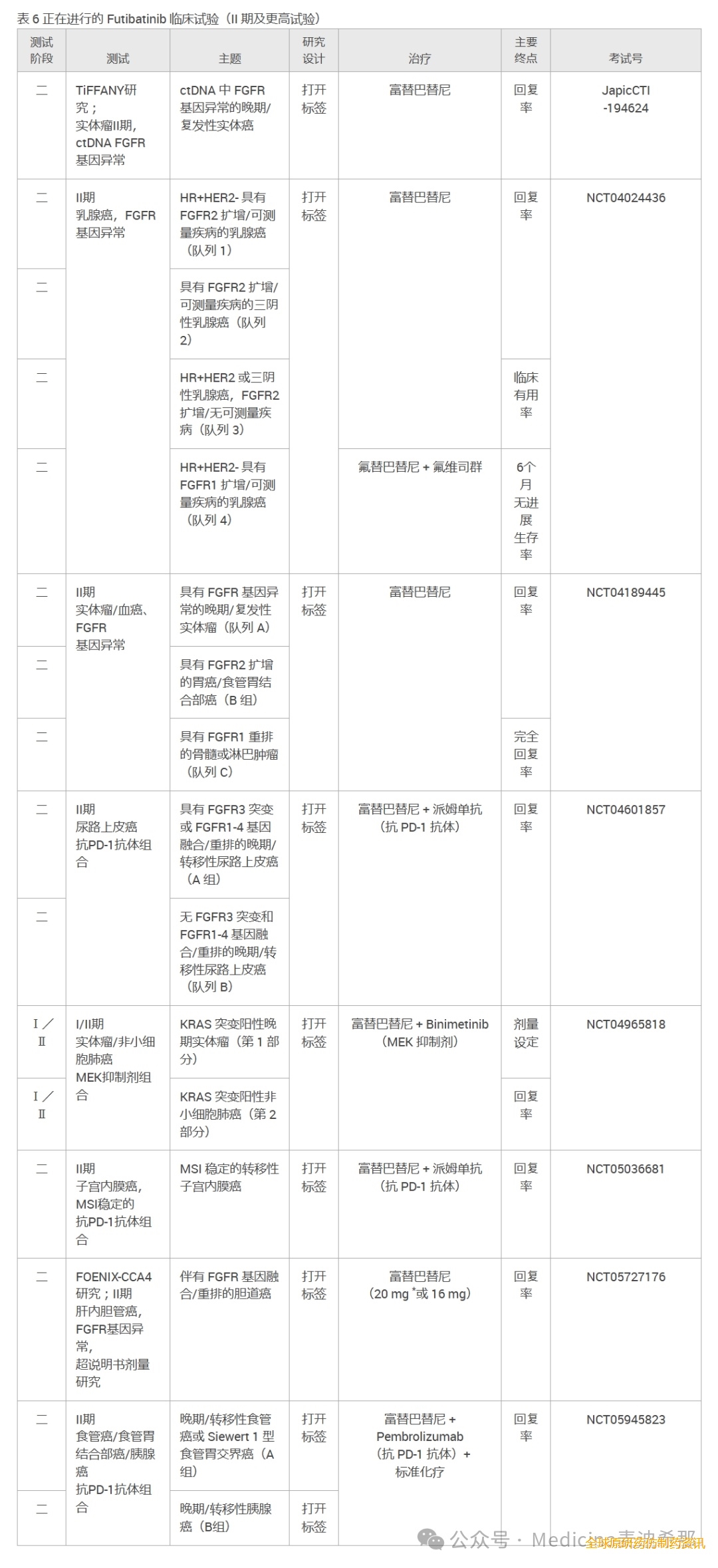 针对 KRAS 基因突变阳性非小细胞肺癌的 Ib/II 期研究 (NCT04965818) 评估了 Futibatinib 和 MEK 抑制剂Binimetinib的联合治疗。一项针对激素受体阳性、HER 阴性或三阴性乳腺癌的 II 期研究(FOENIX-MBC2 研究;NCT04024436)由四个队列组成,正在研究 Futibatinib。一项队列研究了福巴替尼和氟维司群联合治疗具有 FGFR1 基因扩增的激素受体阳性、HER2 阴性乳腺癌,证实了该联合疗法具有良好的抗肿瘤功效和可控的安全性.免疫检查点抑制剂与抗PD-1抗体的联合试验也在进行中(表6),与Futibatinib联合治疗尿路上皮癌、子宫内膜癌、食管癌、胰腺癌等正在进行研究。评估治疗(NCT04601857、NCT05036681、NCT05945823)。在针对食管癌的 Ib 期试验(jRCT2080224975)中,Futibatinib和Pembrolizumab 联合治疗或 Futibatinib 和 Pembrolizumab 联合化疗被证实在每个队列中均具有耐受性且抗肿瘤有效。如果这些发展在未来继续下去,预计它们将使许多患有各种癌症类型的患者受益。