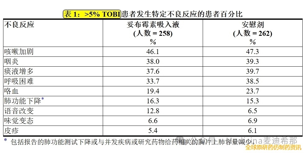 表1 列出了两项 3 期研究期间, >5% 的TOBI患者出现选定不良反应的患者百分比。