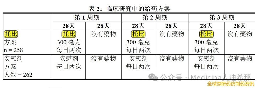 所有患者均接受TOBI或安慰剂(盐水加 1.25 毫克奎宁调味)治疗,此外还接受囊性纤维化患者推荐的标准治疗,包括口服和肠外抗假单胞菌治疗、β2 激动剂、色甘酸、吸入类固醇和气道清除技术。此外,约 77% 的患者同时接受阿法多诺酶(PULMOZYME,Genentech)治疗。