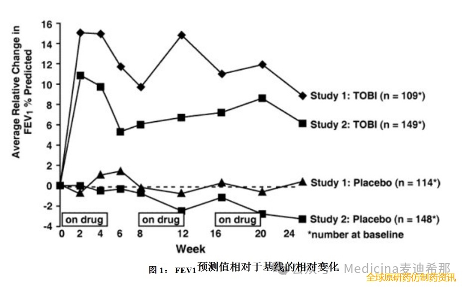 在每项研究中,接受TOBI治疗的患者的肺功能均显著改善。研究1中, TOBI组的改善表现为 24 周内 FEV 1预测值相对于基线(第0周)平均增加约 11%,而安慰剂组患者平均没有变化。在研究2中,接受TOBI治疗的患者平均增加约 7%,而安慰剂组患者平均减少约 1%。图1显示了两项研究中 24 周内 FEV 1预测值的平均相对变化。