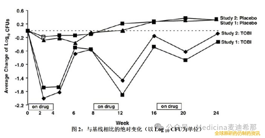 在每项研究中,TOBI疗法均导致服药期间痰中铜绿假单胞菌菌落形成单位 (CFU)数量显著减少。停药期间痰中细菌密度恢复到基线水平。每个连续周期痰中细菌密度的降低幅度较小(见图2)。